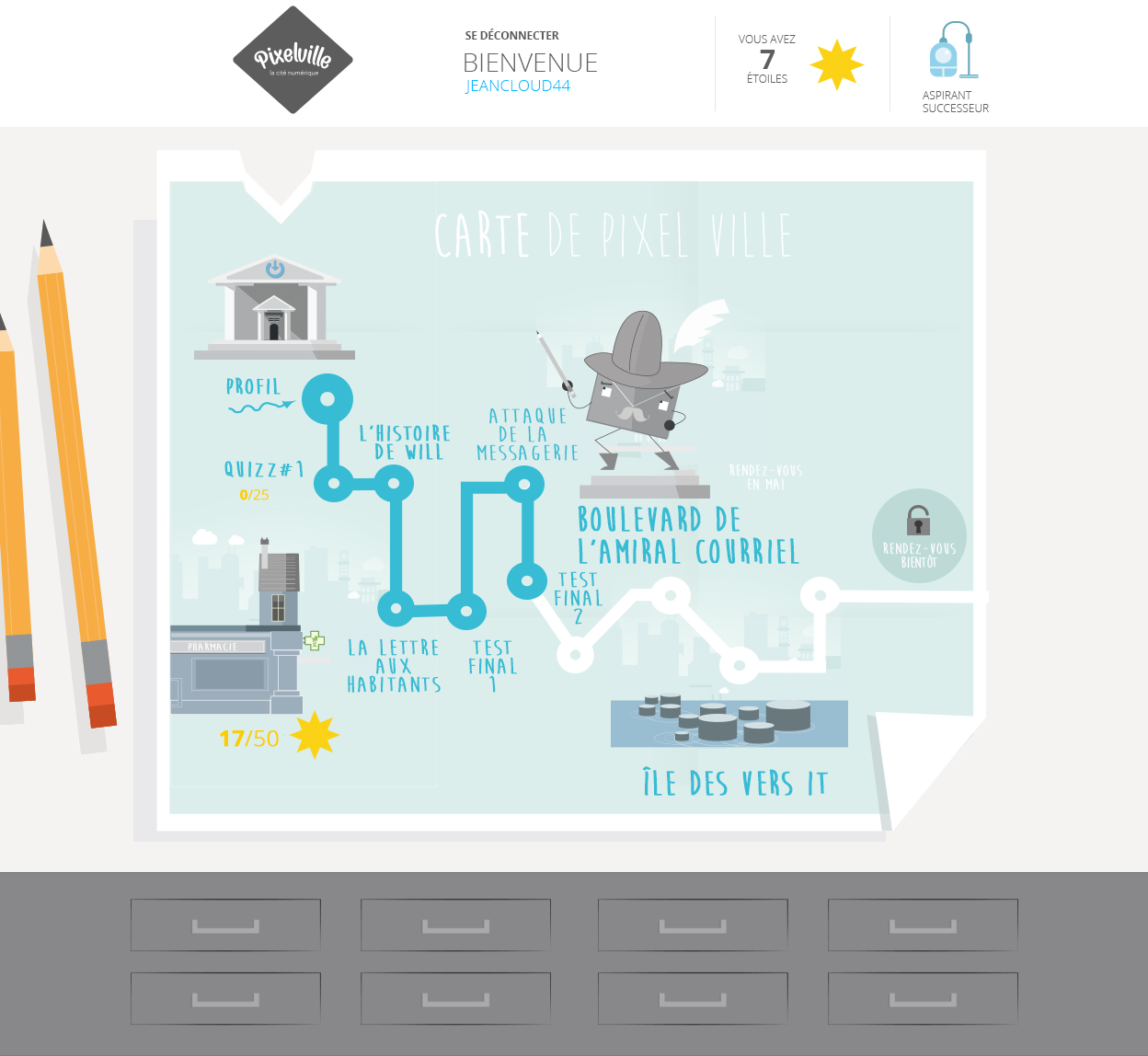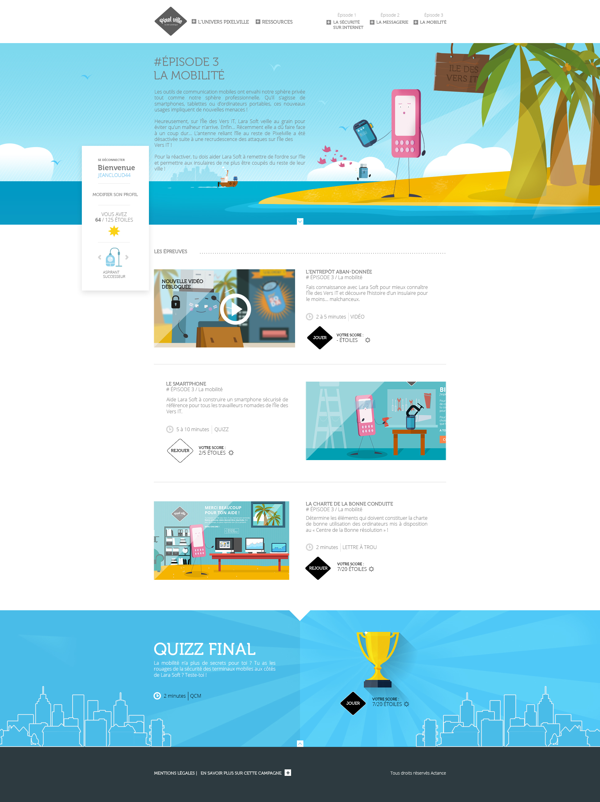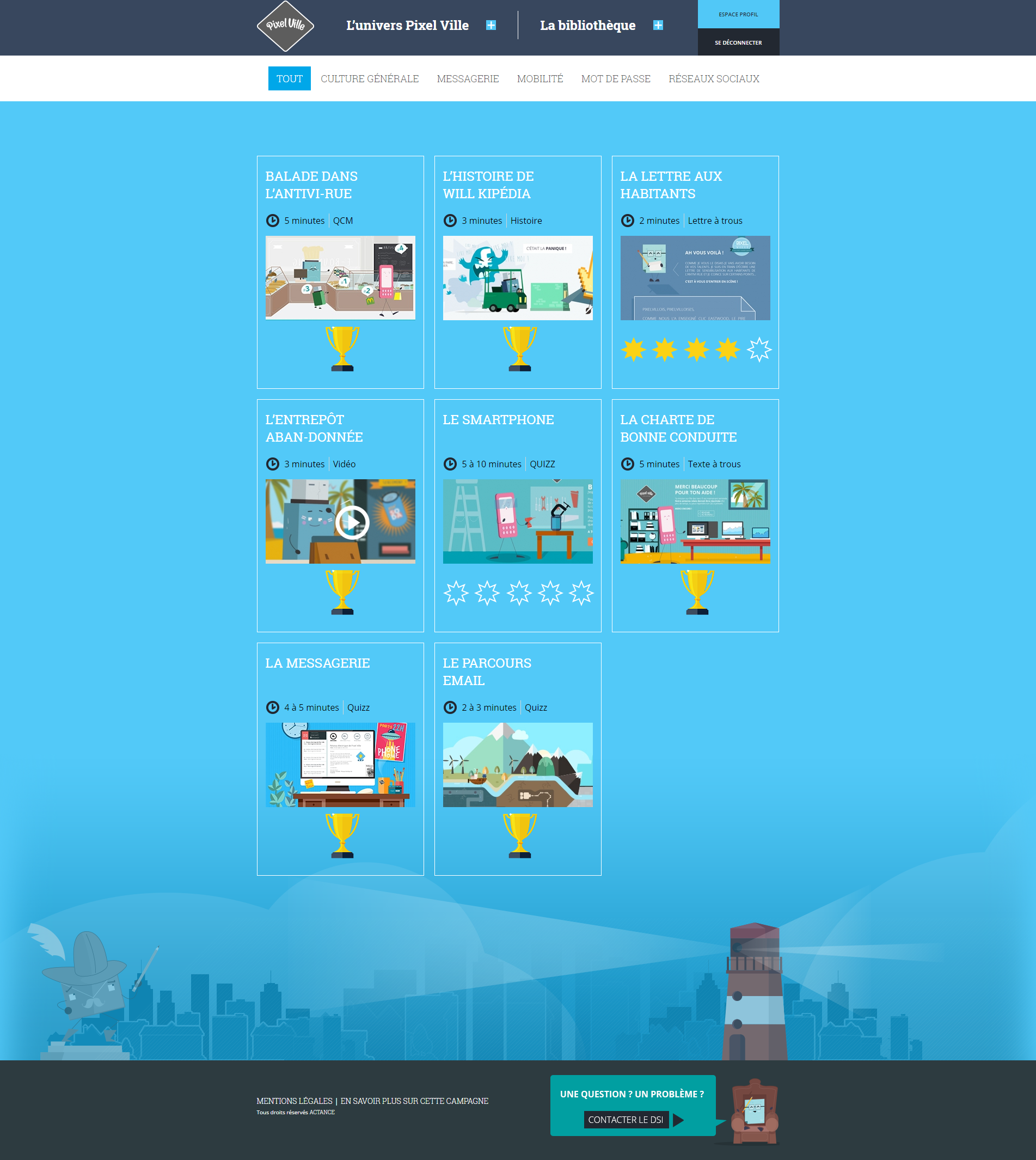 Pixel Ville Pixel Ville est une plateforme e-learning pour sensibiliser les utilisateurs à la sécurité informatique en entreprise. 01. Le client Plusieurs acteurs publiques et privés mutualisent leurs besoins de sensibilisation à la sécurité informatique pour réaliser une plateforme e-learning sur le thème de la sécurité informatique. Il s’agit d’un projet ambitieux pour créer un outil de formation accessible à tous les utilisateurs, quelque soit leurs niveau informatique. Plus de 10 000 utilisateurs sont invités à utiliser l’outil. Client: Pixel Ville Website: pixel-ville.fr Date: 2015-10-07 Services: Développement Front 02. La mission Les objectifs : Faire prendre conscience des risques auxquels est soumis le système d’information; Communiquer les bonnes pratiques et comportements adéquats; Accompagner les collaborateurs sur les nouveaux usages des TIC. 03. La réponse Nous avons développé une plateforme éducative présentant des contenus riches et diversifiés : Des mini-jeux éducatifs Des ressources numériques Des questionnaires interactifs Personnellement, j’interviens en tant que développeur Front-End. La plateforme repose sur des technologies innovantes (HTML5 – CSS 3 – JS – JQuery) et respecte les différents cadres d’utilisation pour assurer la compatibilité sur tous type de navigateurs. Les modules sont variés pour assurer une expérience divertissante : quizz classiques et en drag-and-drop / bande-dessinées animées / motion design / serious game / smart audit interactif.
